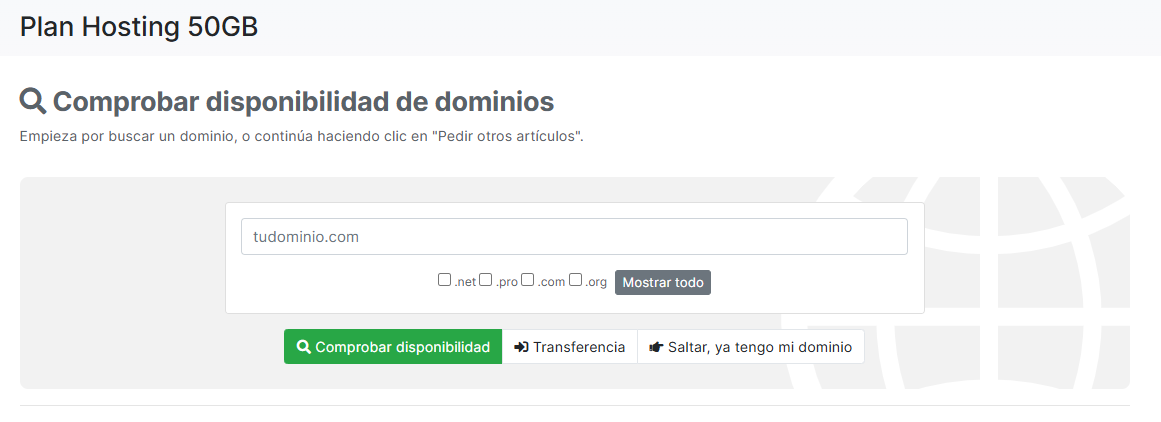 Para contratar el plan de hosting con un dominio ya registrado, sin incluir registro o compra de dominio, sigue este procedimiento paso a paso. Este flujo usa el sistema de pedido que permite saltar la búsqueda de dominios y asociar uno existente más adelante.