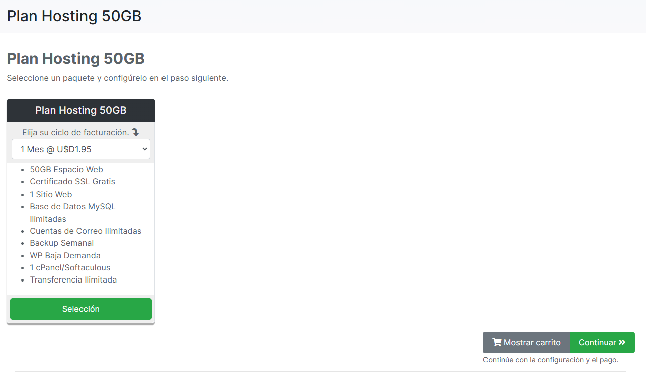 En la pantalla de resumen del Plan Hosting, verifica detalles como el ciclo de facturación (mensual/trimestral/semestral/anual). Haz clic en «Continuar» o «Siguiente» para proceder a opciones configurables.