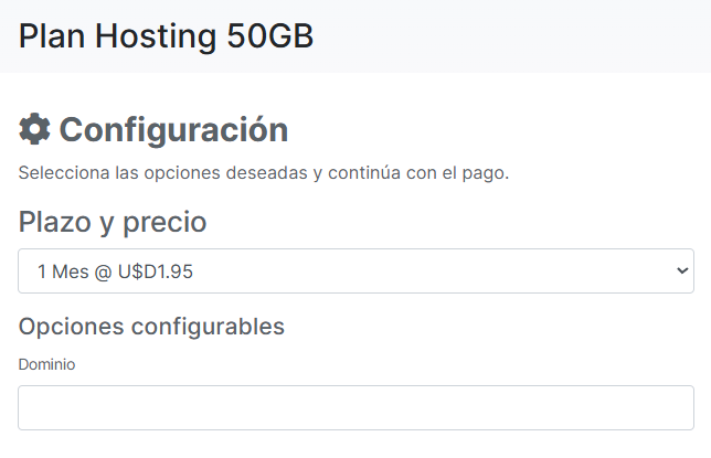 Llega a la sección «Opciones configurables». En el campo «dominio», ingresa exactamente tu dominio registrado (ej. tudominio.com). Completa datos de contacto, elige ciclo de pago y haz clic en «Continuar» para carrito.